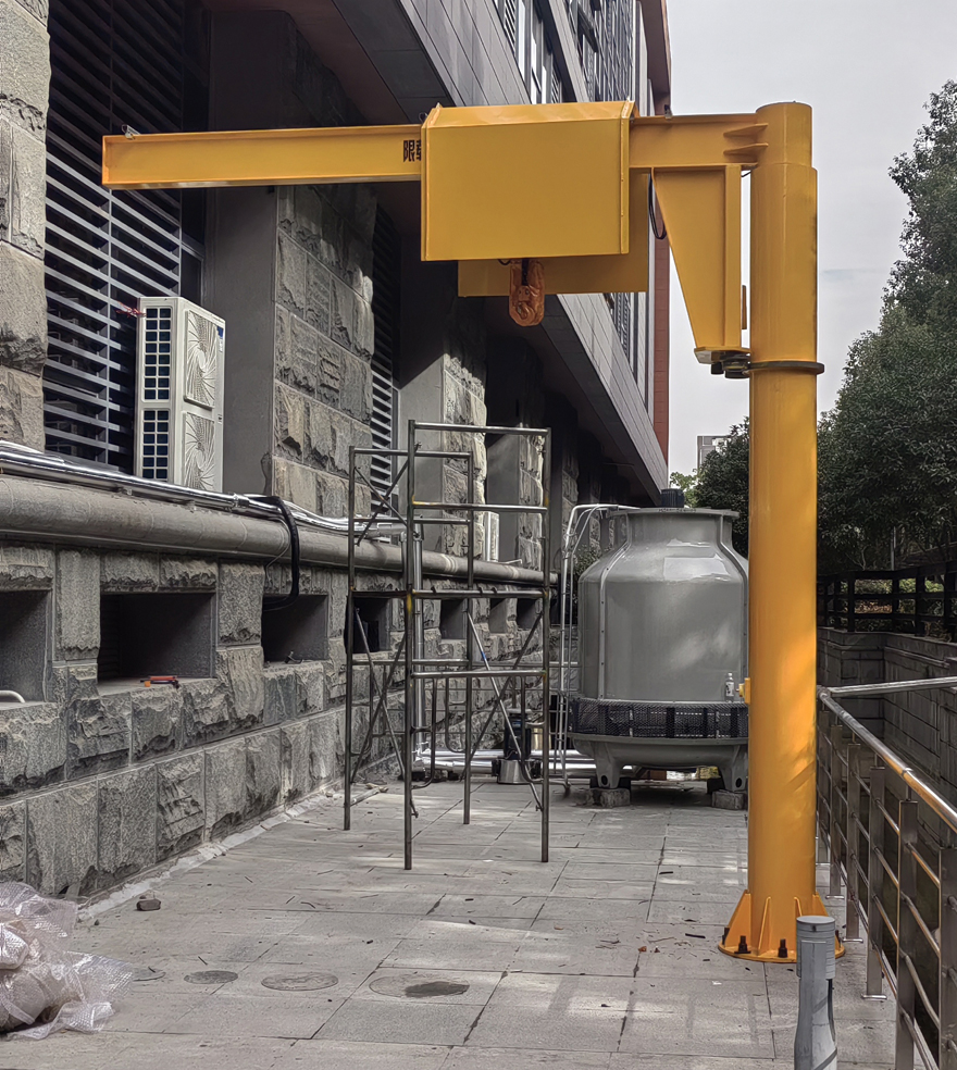 立柱式旋臂吊立桿選用圓鋼管生產制造,兩邊分別電焊焊接底版和圓弧,上端安裝腰圈路軌。底版根據化學螺栓與水泥地面聯接固定不動,確保懸臂吊的可靠性。圓弧上打有形孔,建立電纜線從立桿內部隱蔽工程裝線。